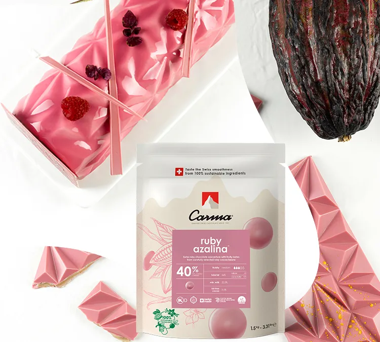 Our Carma Ruby Azalina™ 40%, created by our chocolate experts here in Switzerland, harnesses the unique natural qualities of ruby cocoa beans to produce an extraordinary new sensation for chocolatiers, pastry chefs, confectioners, and bakers worldwide.